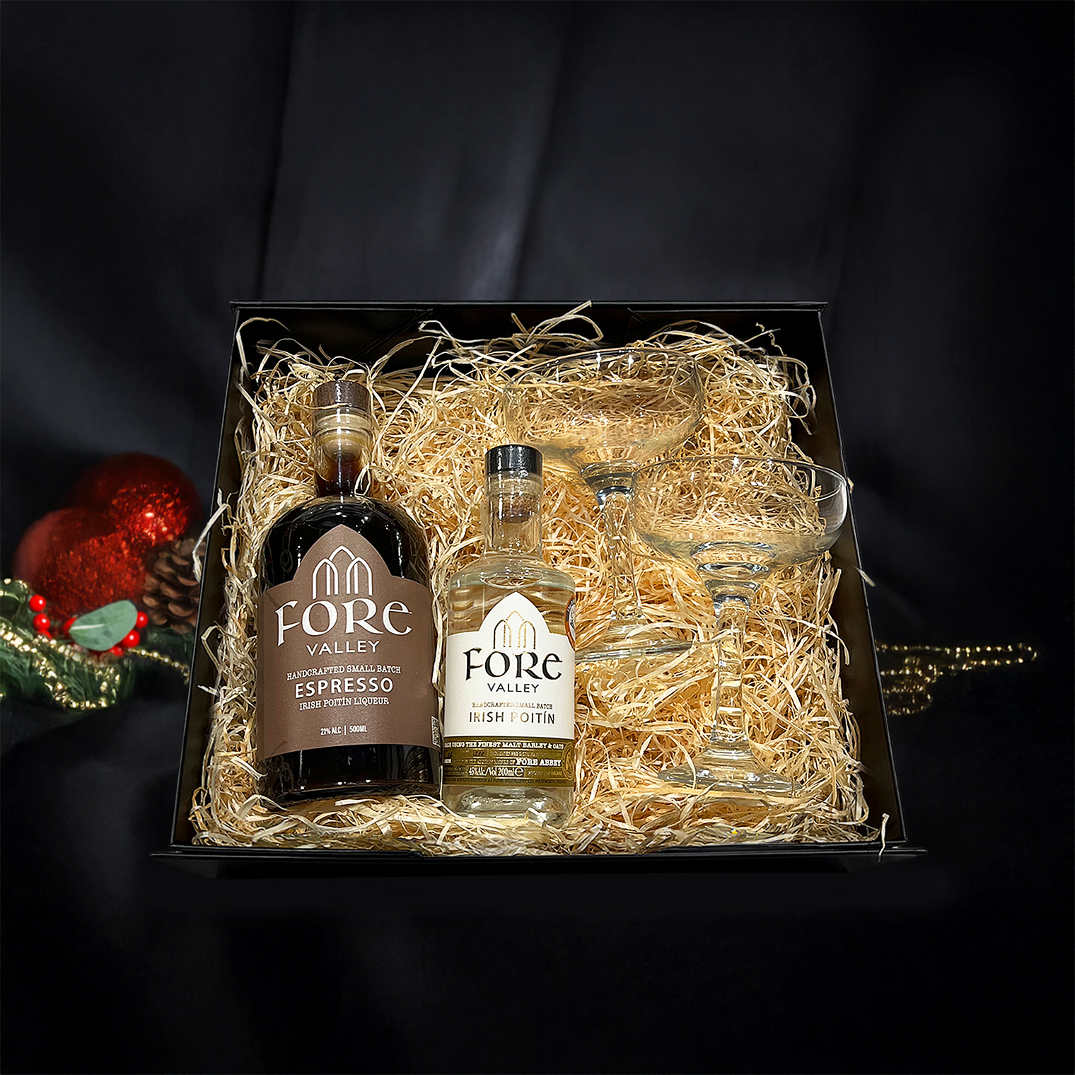 This luxurious hamper features a 500ml bottle of Fore Valley Espresso Poitín Liqueur, a 200ml bottle of Fore Valley Irish Poitín, and two martini glasses. Complete with all the essentials needed to make the perfect Fore Valley Espresso Poitíni, it’s the merriest gift you can give someone special this Christmas!