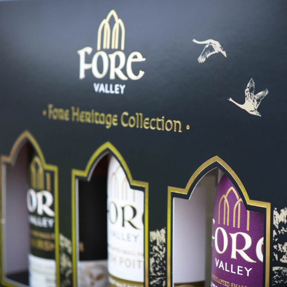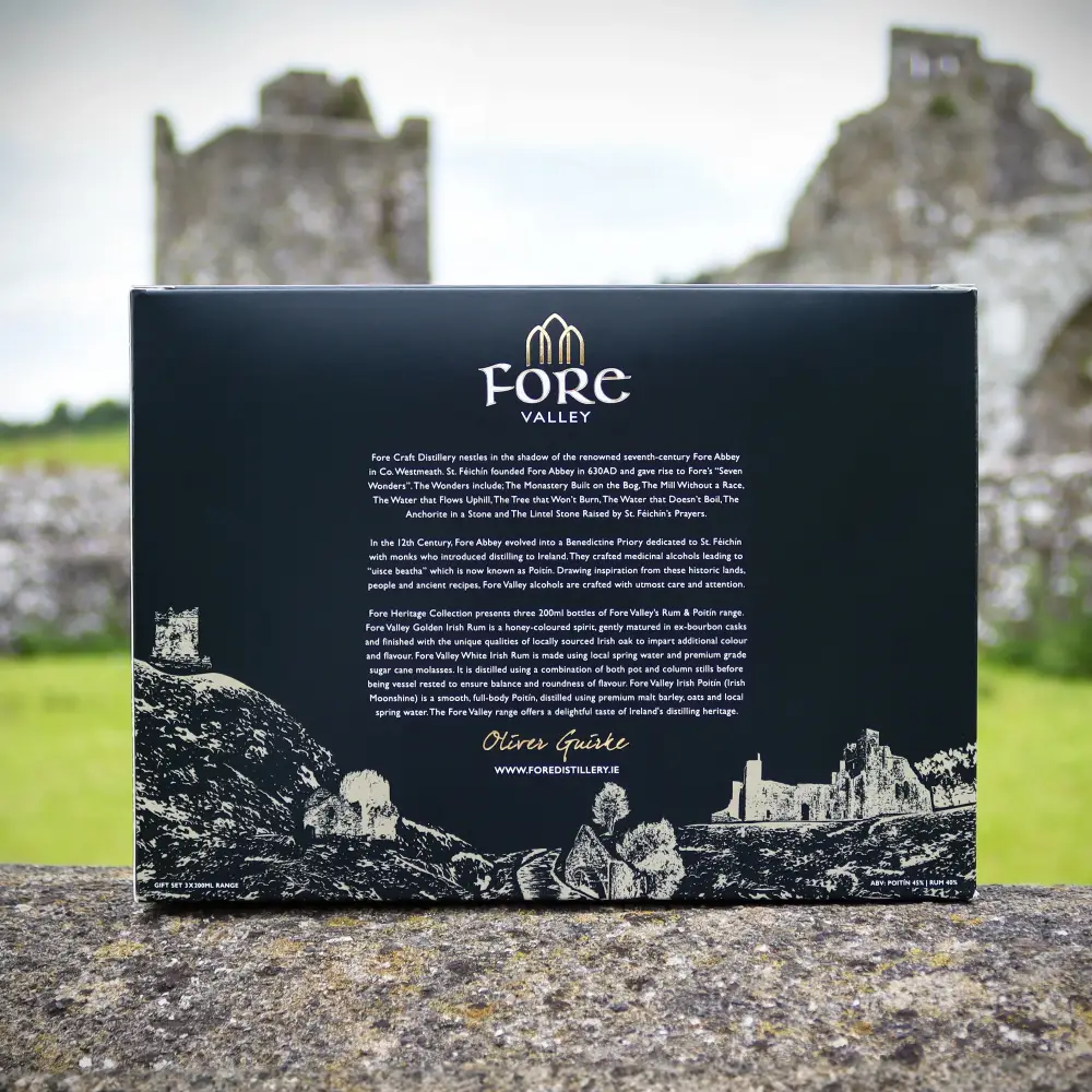 Presented are three 200ml bottles of Fore Valley’s Rum & Poitín range. Depicted on the set are the famous ‘Seven Wonders of Fore’ in a wrap around illustration of the Fore Valley, the spirits are revealed through gold framed windows symbolic of the monastic architecture found in Fore and a sentiment to the nearby Children of Lir adorns the top of the collection.