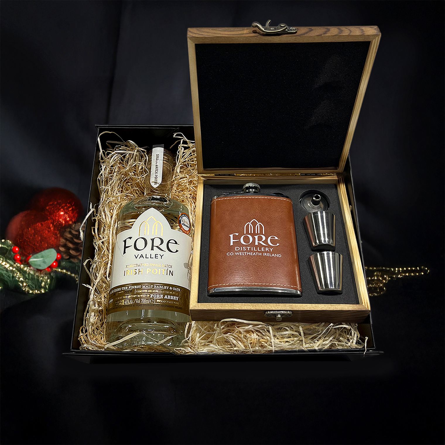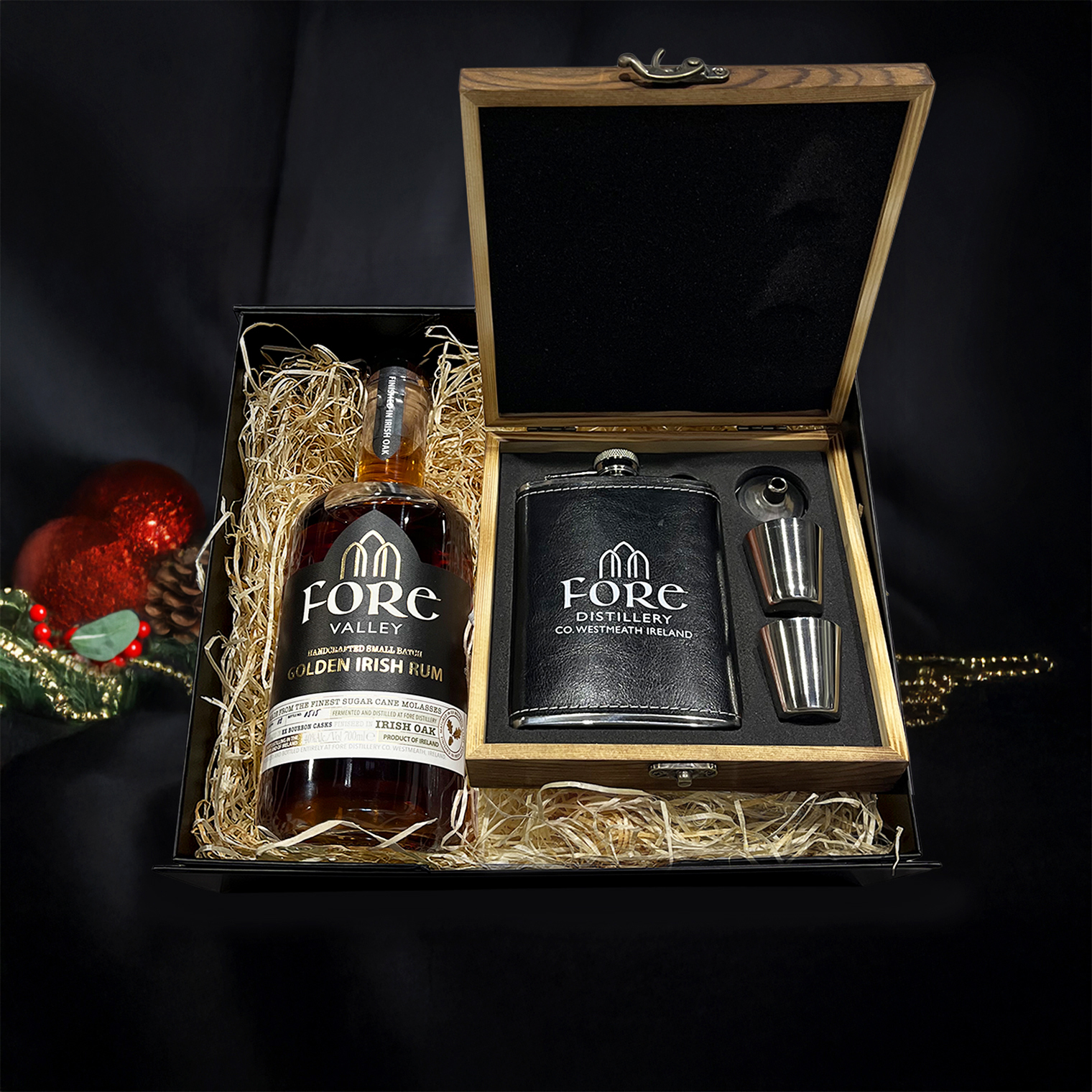 This luxurious hamper features a 700ml bottle of Fore Valley Golden Irish Rum or White Irish Rum or Irish Poitín with an accompanying Hip Flask Set! The Hip Flask Set includes two measures, a pouring funnel and a sleek 8oz hip flask presented in a wooden clasp box. Complete with everything needed to make the perfect Fore Valley tipple kit, it’s the merriest gift you can give someone special this Christmas!