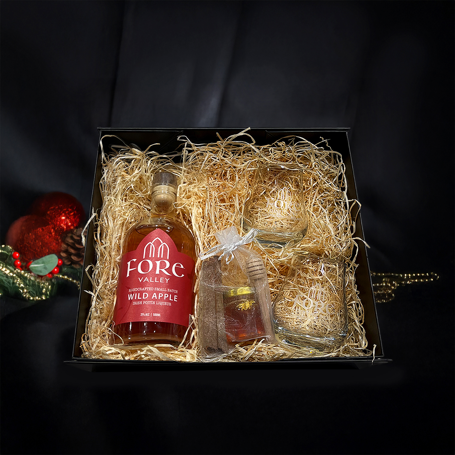 This luxurious hamper features a 700ml bottle of Fore Valley Wild Apple Poitín Liqueur, two white-frost branded Fore Distillery glasses, and a miniature honey, drizzler, and cinnamon set. Complete with everything needed to make the perfect Fore Valley Hot Apple Toddy, it’s the warmest and merriest gift you can give someone special this Christmas!