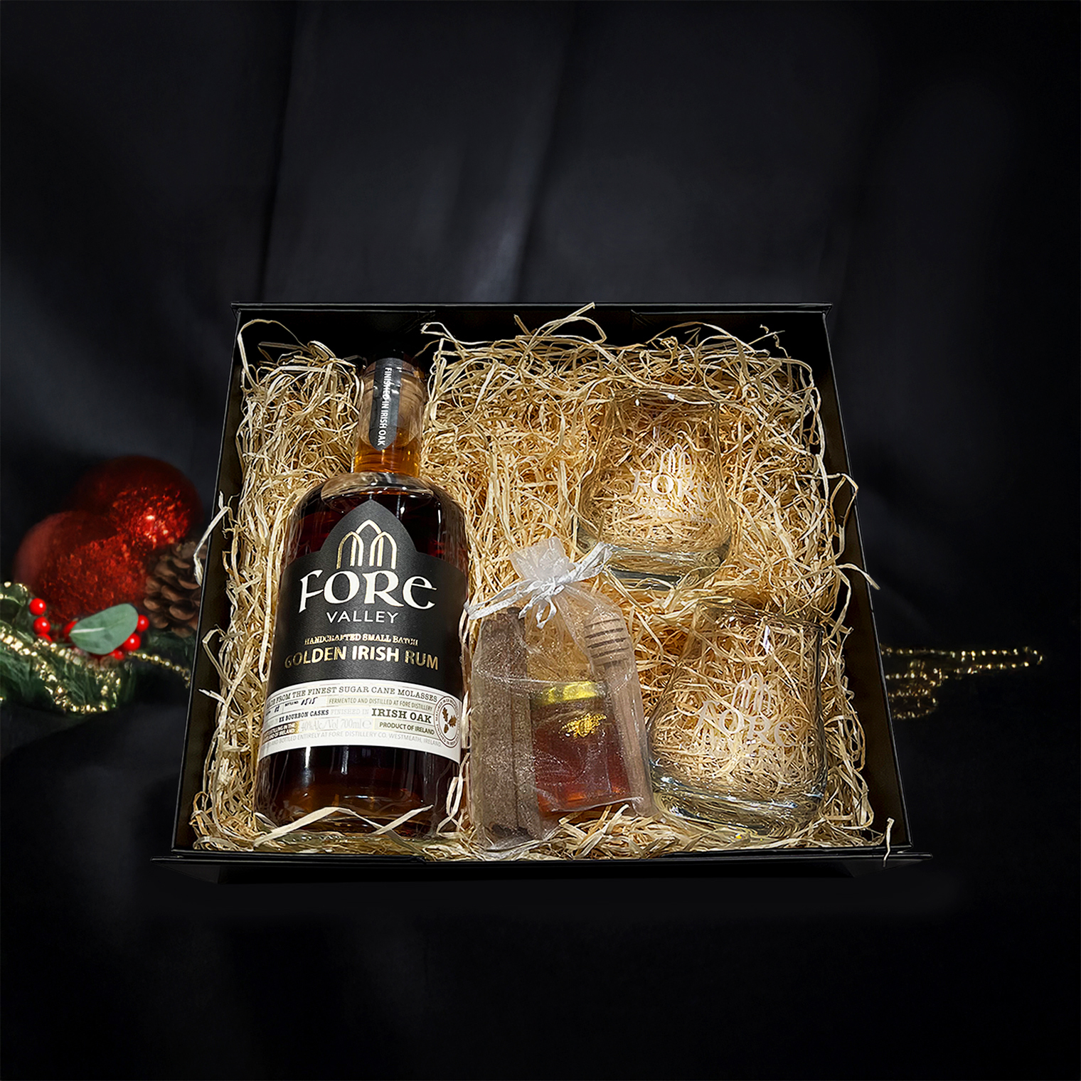 This luxurious hamper features a 700ml bottle of Fore Valley Irish Poitín or Golden Irish Rum, two white-frost branded Fore Distillery glasses, and a miniature honey, drizzler, and cinnamon set. Complete with everything needed to make the perfect Fore Valley Hot Toddy, it’s the warmest and merriest gift you can give someone special this Christmas!